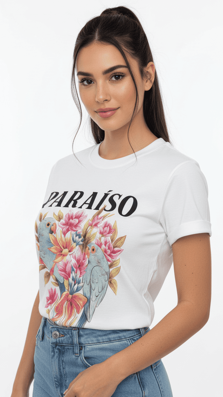 T-shirt Tee ParaÃso Brasil – 100% Algodão Estampa Araras & Rosas